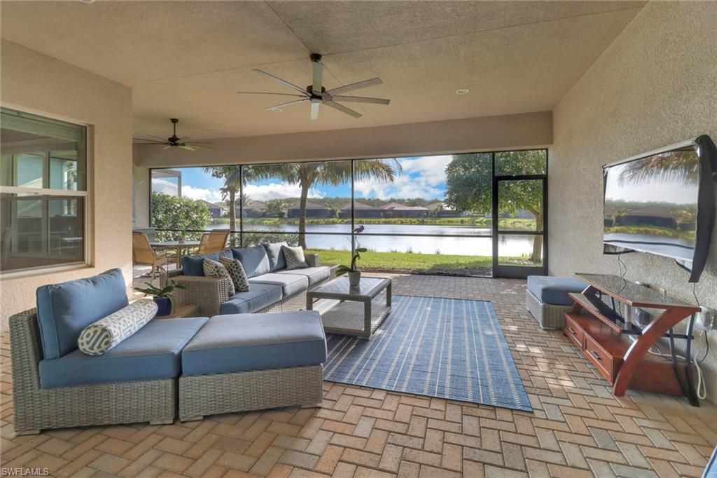 Enjoy glittering lake views from this generously appointed 2,878 sq. ft. Julia model situated on one of the prettiest locations in Valencia Bonita. This home comes FURNISHED and has 3 bedrooms plus a den/library, 3 1/2 baths, and a 3 car garage with epoxy flooring, widened sidewalk, full house generator, impact glass throughout, privacy glass in all bathrooms, custom closet systems with pocket doors in all bedroom closets. The kitchen has an upgraded level 3 kitchen island, stainless steel appliances, a Bosch dishwasher, chimney hood, extended tiled glass backsplash, and quartz countertops. High-end level 3 kitchen cabinets with pull-out drawers and shelves, plus under & over cabinet lighting. The spacious master bedroom offers his and her closets and a master bath with tile upgrade, shower enclosure with additional hand-held shower head, and dual sinks. Tile on the diagonal, high hats, and blinds throughout, plus crown molding. The spacious extended lanai has two fans and a full outdoor kitchen. Valencia Bonita is ideally located in a peaceful area on East Bonita Beach Rd., just minutes from beaches, fine dining, and shopping plus the community offers unsurpassed amenities including a 45,000 sq. ft. Clubhouse and Lifestyle Complex with full-time staff providing residents with indoor/outdoor dining, broadway style shows & entertainment, fitness studio, clubs, nail salon & spa, resort and lap pools, resistance pool, pickleball, tennis, bocci, dog park, and more. You truly have to experience it to appreciate all that this 55+ Active Adult Community has to offer.